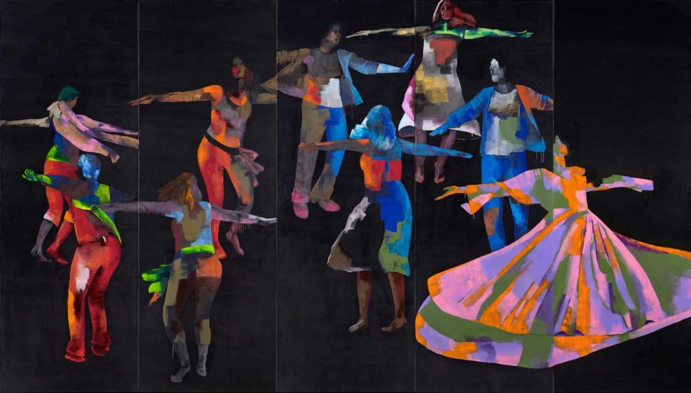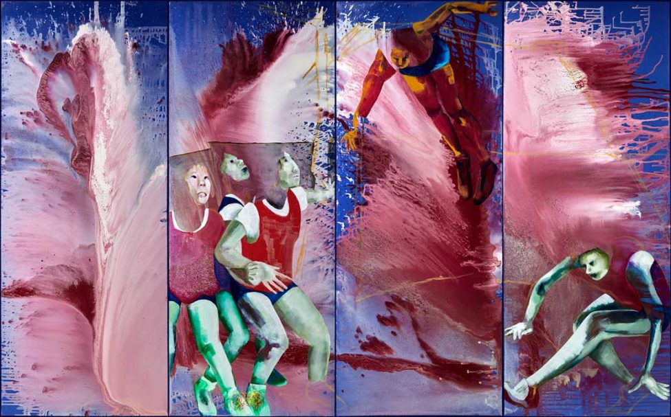 In the work Cranes, the aesthetics is of calamity. The meeting of material with content is central to Dina Levy’s work, as is the tension between background and image. In this work the figures appear to be engaged in a sports activity having their faces masked. The artist uses images from the world of sports, in order to bring to mind everyday concepts, like cooperation, collaboration, competition, and winning.