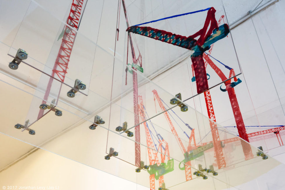 In the installation Shelves the artist chose cranes to represent the concept of floating and being grounded at the same time. Cranes are dominant in Dina Levy’s day to day urban landscape. They materialize in groups and for her they are a pack. The crane is also a force multiplier, much like a group that is more than the sum of its parts. For Dina Levy, cranes trigger a sense of wonderment because of their size, their height and the way they dwarf man, but they are also threatening and a source of anxiety. Another image in this installation is the snake, bringing to mind the expulsion from Eden. Man’s choice to taste the fruit from the tree of knowledge is his first act of free will and it brought on loneliness and helplessness. The conflict between the desire for freedom and the fear of loneliness surfaces again.